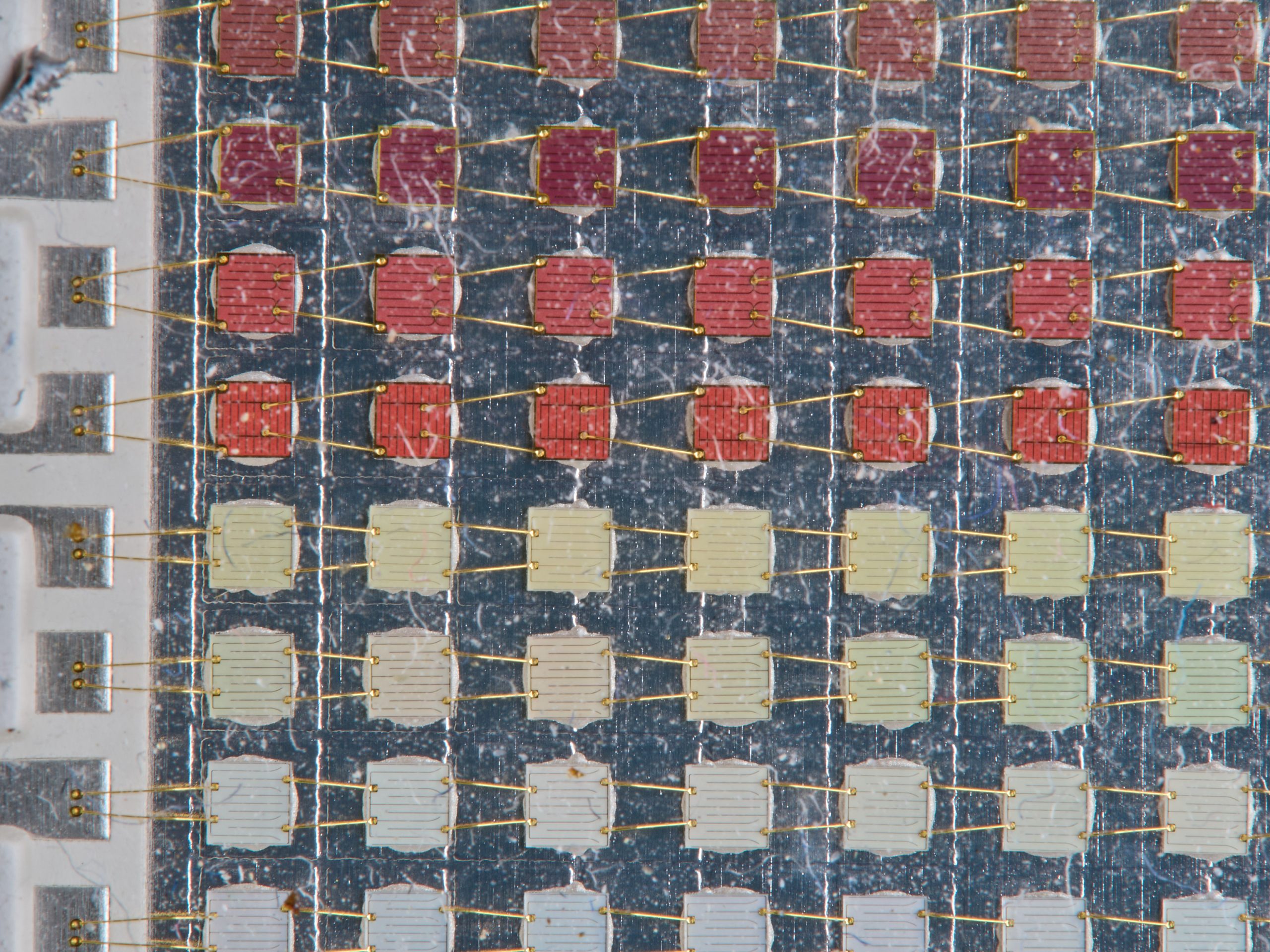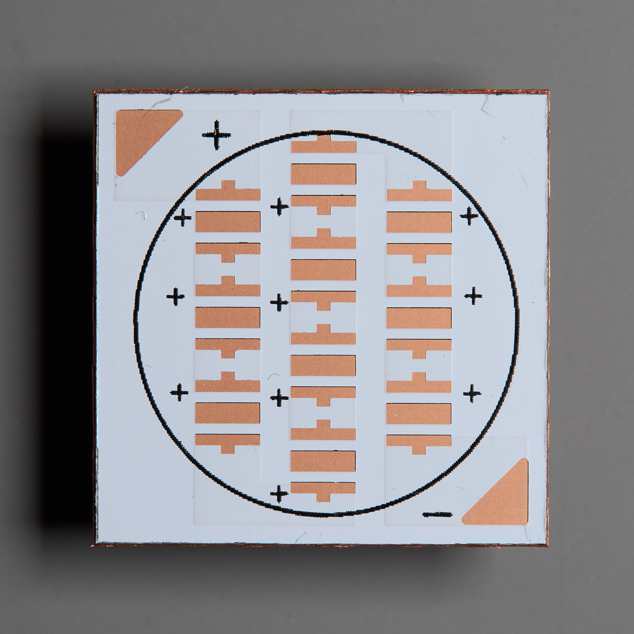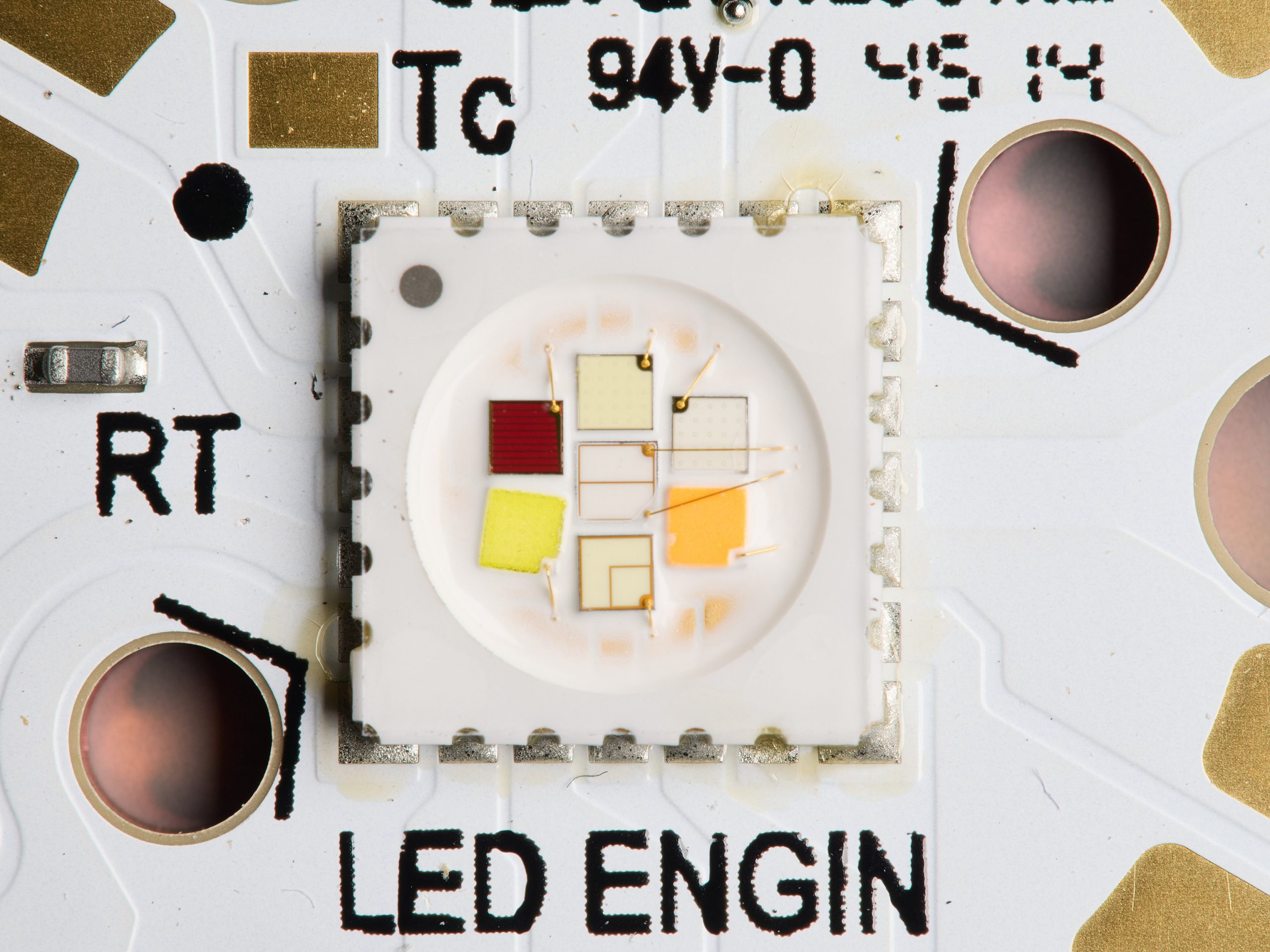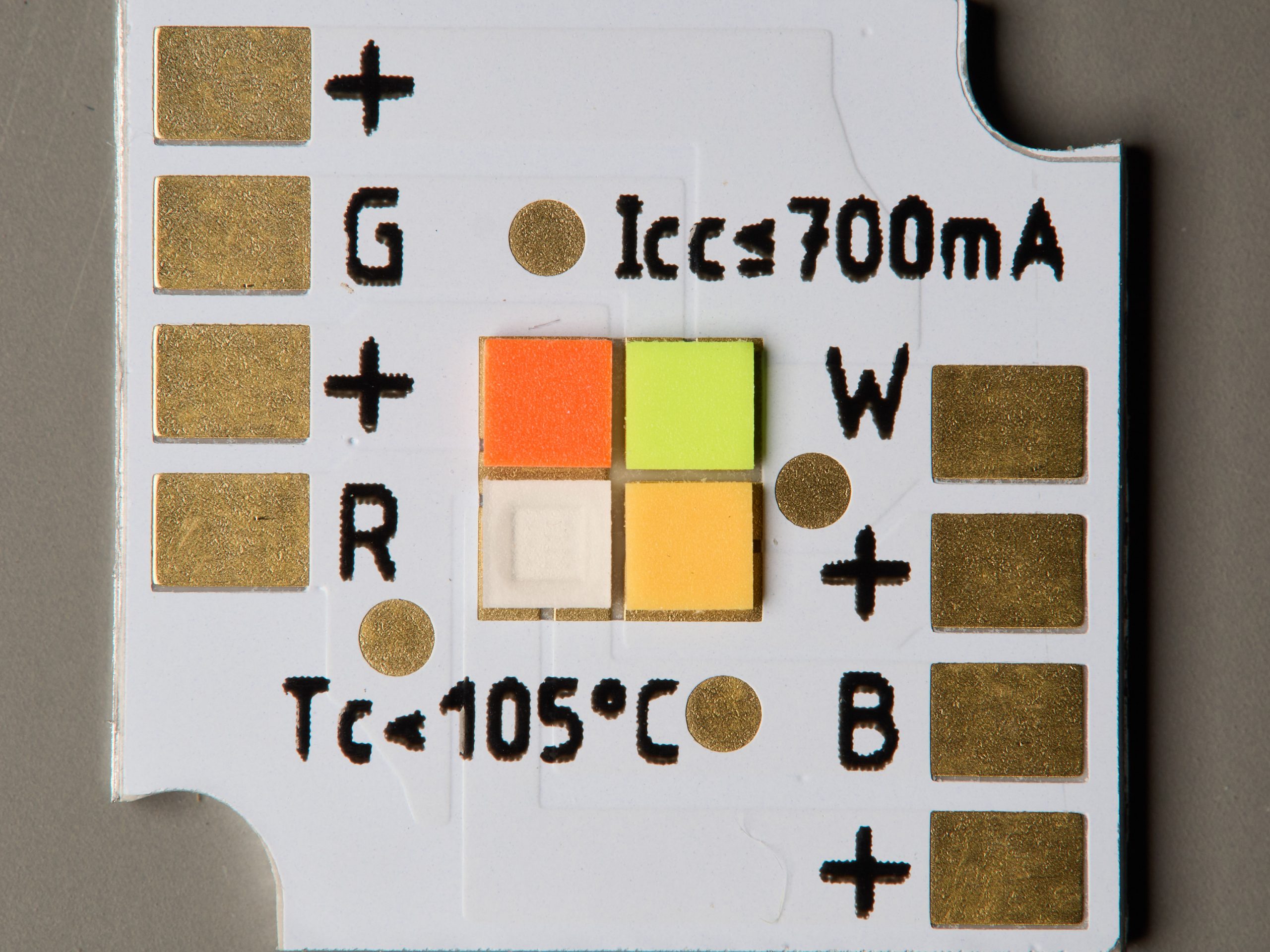 Assembly of individual LED chips into an array is a specialized job that can be done manualy under a (stereo) microscope using special tools and potting compounds, or using robotic machines. The choice tends to depend on the number of arrays to be assembled. The array shown in the photographs below used to be available of-the-shelf as a standard type produce in large quantities. In this case the seven chips are packaged together into a special SMD package, and then this single SMD is soldered into a copper metal core board.