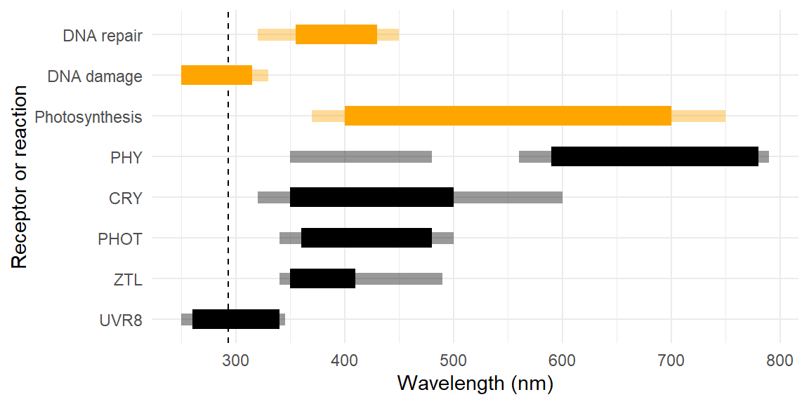 The photoreceptors UVR8, CRYs and PHYs, jointly control responses affecting optical properties and display of leaves, that can modify the sensitivity to UV radiation by attenuating it or reducing its interception (Rai, Morales, and Aphalo 2021). The optical properties of the epidermis vary during the course of the day and in response to exposure to blue light and UV radiation (Barnes et al. 2015) and also seasonally (Solanki et al. 2019). Even changes in optical properties of single stranded DNA in chloroplasts can affect sensitivity to damage by UV-B exposure (Saeid Nia et al. 2023). Plant species differ in their responses as a result of evolution; however broad patterns can be detected across species on the responses to different wavelength bands of sunlight (e.g., Wang et al. 2020). Thus, current understanding of plant responses to UV, VIS and NIR radiation indicates that a broader perspective is needed in the study of plants’ responses to UV and VIS radiation across multiple time scales (Barnes 2017; Barnes et al. 2018; Robson et al. 2019).