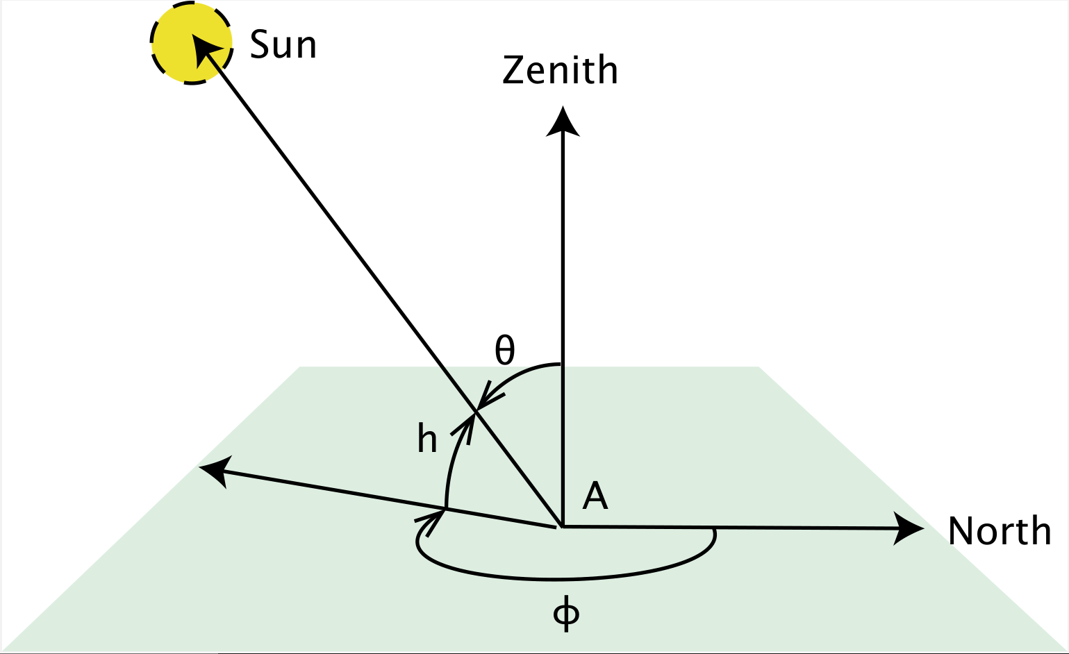 When studying plants we frequently need to describe the position of the sun because of its effect on spectral irradiance and as a determinant of day length. The azimuth angle (\(\phi\)) is usually measured clockwise from the North on a horizontal plane. The position on the vertical plane is measured either as the zenith angle (\(\theta\)) downwards from the zenith, or as an elevation angle (\(h\)) upwards from the horizon. Consequently \(h + \theta = 90^\circ = \frac{\pi}{2}\,\)radians. When describing the position of the sun as in Figure 4.1 the observer is situated at the origin of the system of coordinates used to describe the angles.