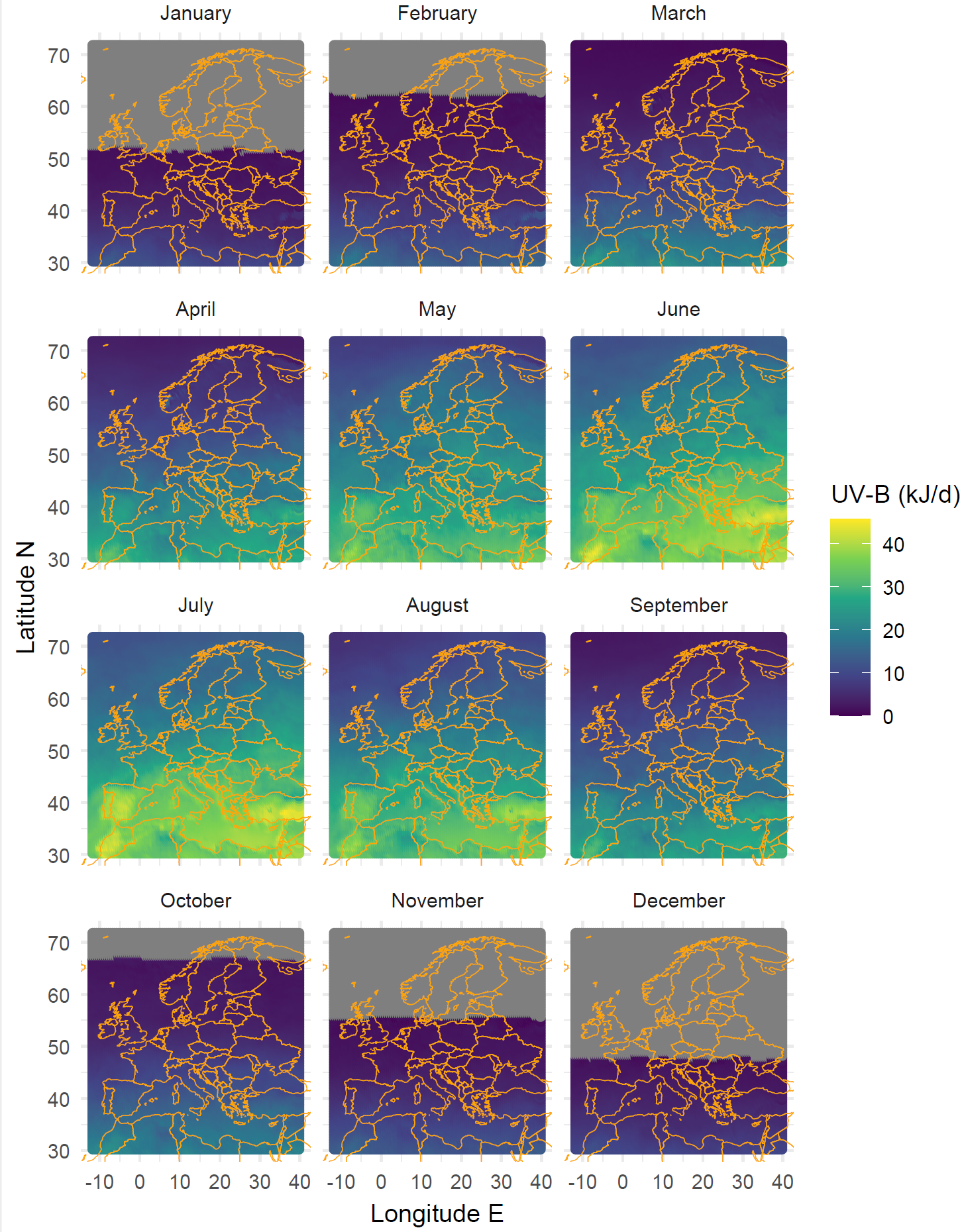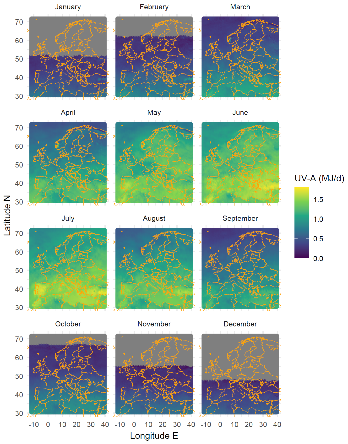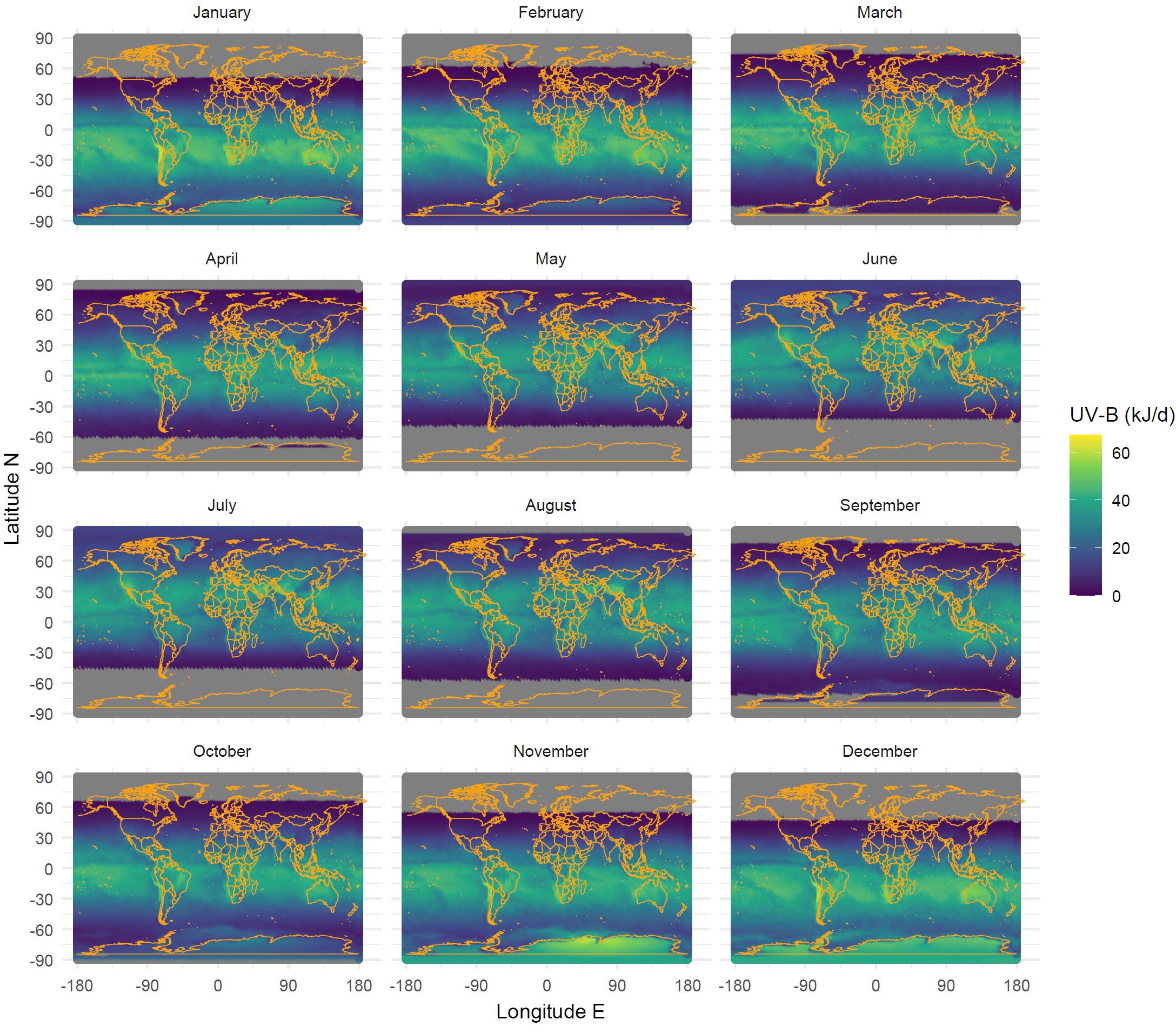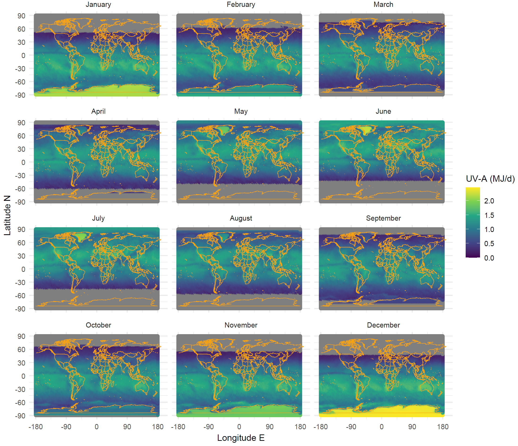 Maps for global radiation, UV-B, and UV-A could be added to this section. The daily data are available on-line on a 1/2 degree grid for the last >10 years. Some biologically effective exposures are also available. This is a lot of data. I have already downloaded the last 12 months. Downloading the whole time series with worldwide coverage and computing long-term means would be doable I think, but time consuming. For the time being here are maps for UV-B and UV-A with monthly means of daily doses for the whole world.