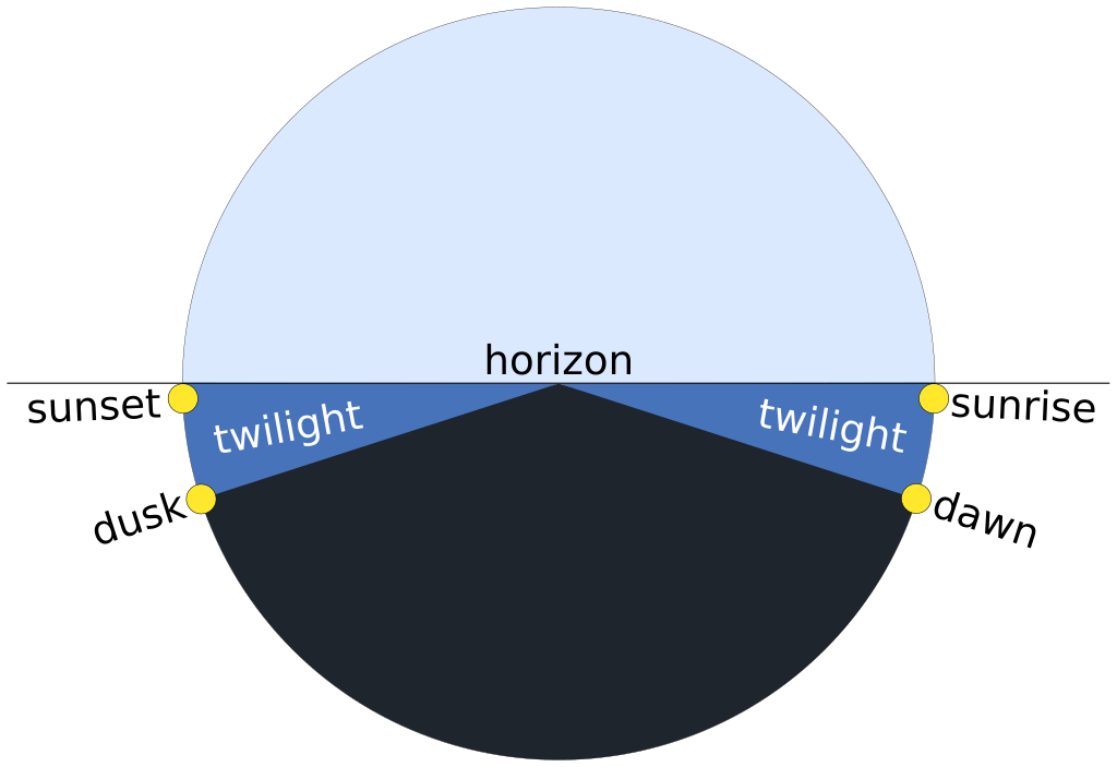 Twilight is the period before sunrise and after sunset when there is more intense diffuse light than further into the night (Figure 4.2). The definitions of twilight are based on practical considerations of human activities, and called civil, naval and astronomical (Figure 4.3). During civil twilight artificial lighting is usually not needed in cities. For nautical twilight I have seen two descriptions: 1) before nautical dawn and after nautical dawn it is possible to navigate based on the stars, and 2) after nautical dawn and before nautical dusk navigation by sight is possible. Before astronomical dawn and after astronomical dusk stars of sixth magnitude are visible. These three descriptions are very approximate, as they do not consider the effect of clouds, light pollution from artificial sources, or other source of light.