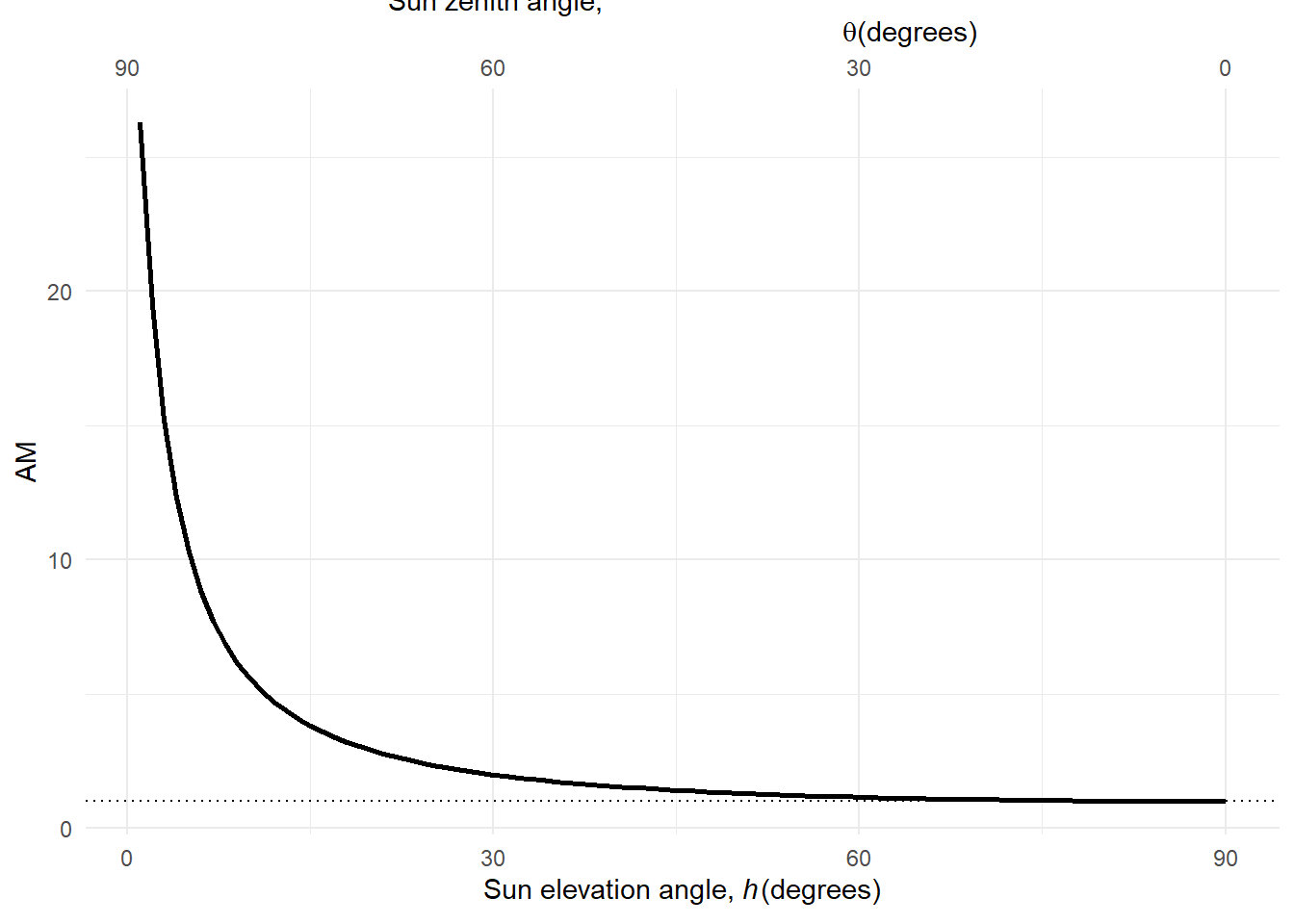The air mass traversed is, in reality, not exactly proportional to the distance computed by trigonometry, but not far from it. An empirical formula (Kasten and Young 1989) can be used as a better approximation to the computation of AM values from the elevation angle (\(h\)) (Figure 4.10).