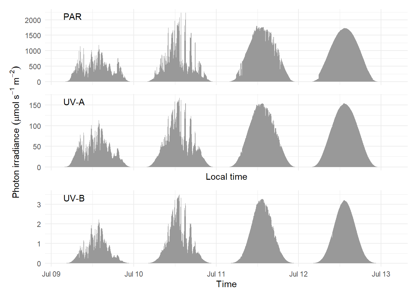 I have data for 2-3 years time series measured with the same sensors as the four days plot above. Could be added as they include separate measurements of UV-B, UV-A2, UV-A1, blue, red, far-red and PAR irradiances. Maybe a figure with daily averages per month or week or showing a moving average or moving median could be informative. What do you think?