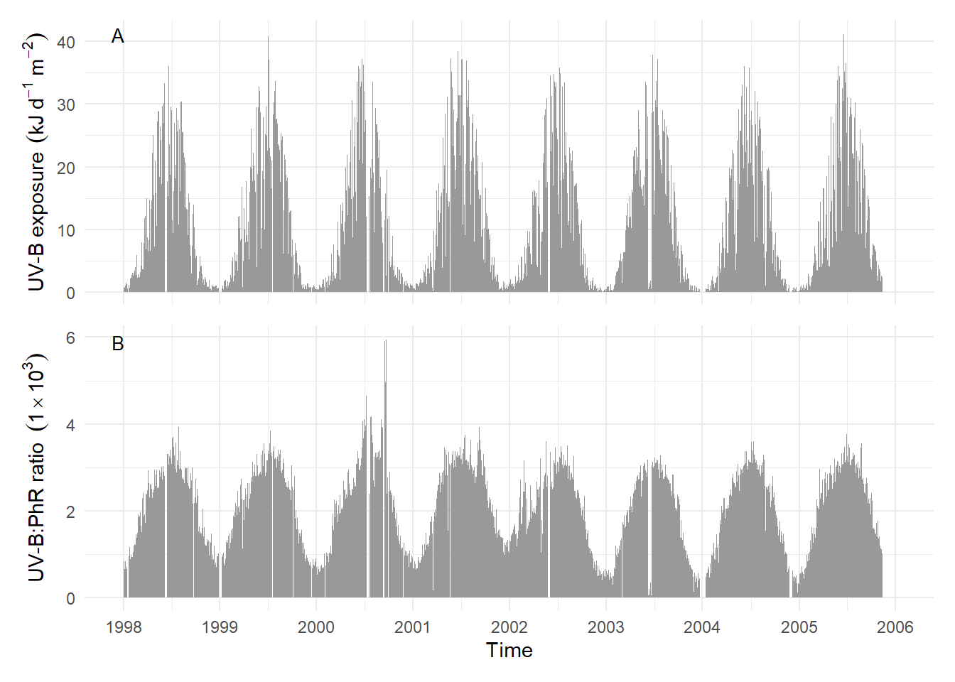 Considering a longer time scale of years, seasonal and daily variation are combined. The seasonal pattern of variation in UV-B daily exposure is very clear but has day to day variation superimposed Figure 4.29. The strong change in the UV-B:PAR photon ratio with sun elevation creates a strong seasonal pattern in this photon ratio Figure 4.29.