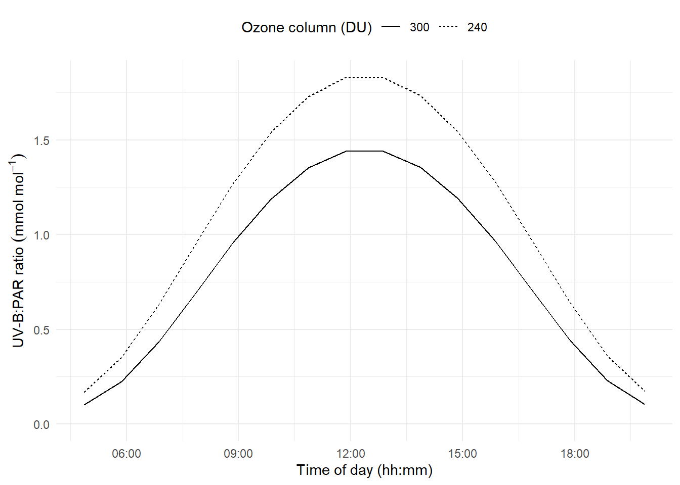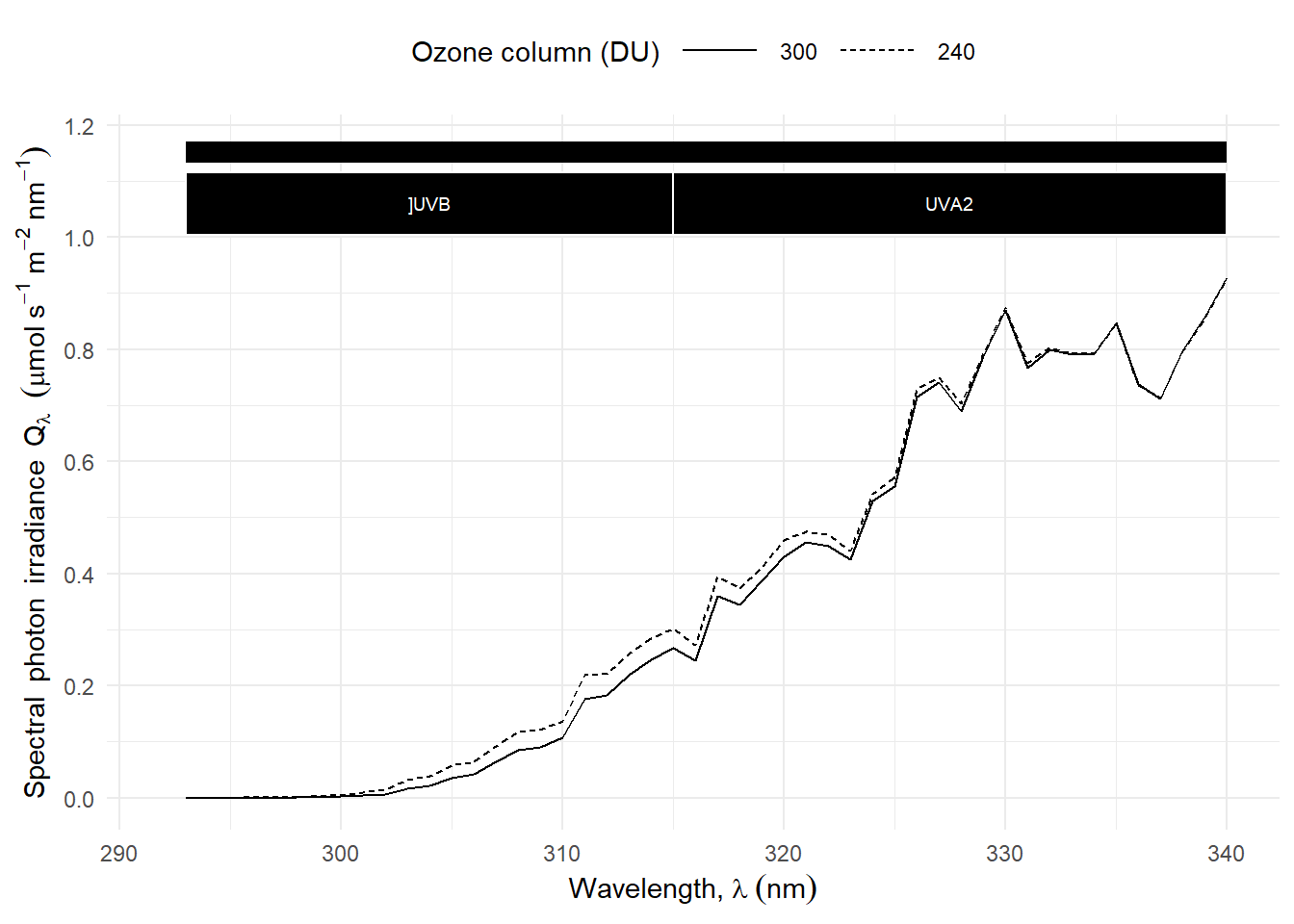 The spectral wavelength distribution is also modified by the amount of ozone in the atmosphere, known as the ozone column and measured in Dobson units (DU = mm of pure ozone) Figure 4.20. As expected, it is also affected by the air mass traversed, which depends on sun elevation. The UV-B:PAR photon ratior is more strongly dependent on the thickness of the ozone column at low sun elevations, when the ratio it smallest Figure 4.20.