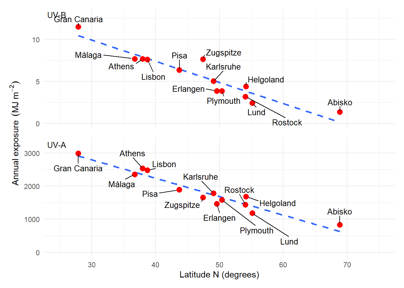 The main determinant of changes in spectral irradiance with seasons and latitude is the changing path of the sun through the sky, and consequently of the sun elevation angle. However, several other variables play a role. The depth of the ozone column varies with latitude and seasonally. Clouds and the water column depth vary locally and with latitude, as does ground elevation and albedo. The result is that spectral irradiance varies in time and space. One way of summarising this is to describe the local climatology using maps with monthly averages over several years interpolated over a geographic grid. One approach is to use data retrieved by instruments on board satellites. An alternative approach is to describe terrestrial solar radiation at locations where ground-level measurements are available. We start with examples based on this second approach and observations with broadband sensors from ELDONET. From the perspective of research with plants the availability of UV-B, UV-A and PhR data measured concurrently is important.
