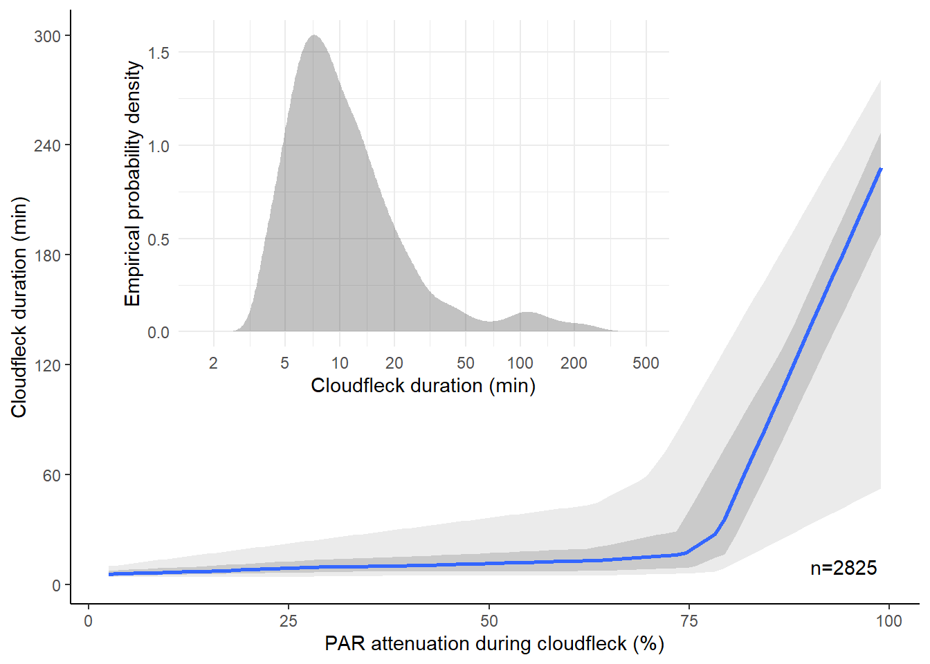 The low irradiance periods interspersed with higher irradiance ones, caused by moving clouds intermittently occluding the sun, or cloud flecks, have a haphazard dynamics that is very dependent on the cloud type and wind conditions. One way of describing them is by estimating an empirical probability density function for their duration Figure 4.25. The distribution is not Normal, and skewed to the right. Semi-transparent and small clouds attenuate irradiance less that large thick clouds and at the same time create cloud flecks of shorter duration Figure 4.25.