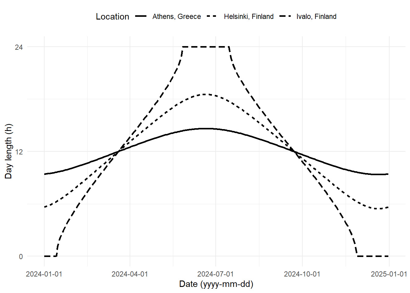 The day length through the year computed for three cities, one of them, Ivalo at the northern latitude within the Artic circle.