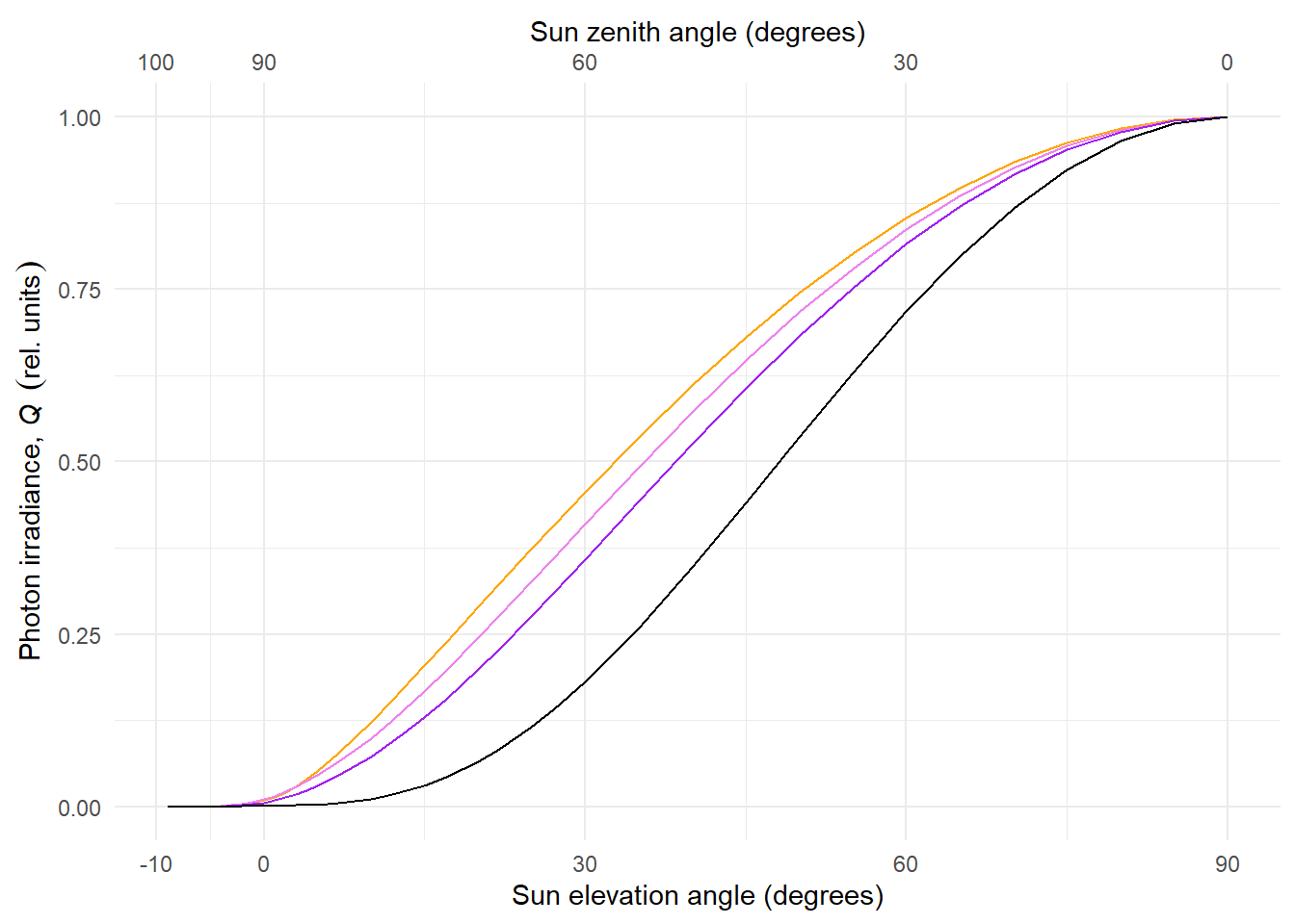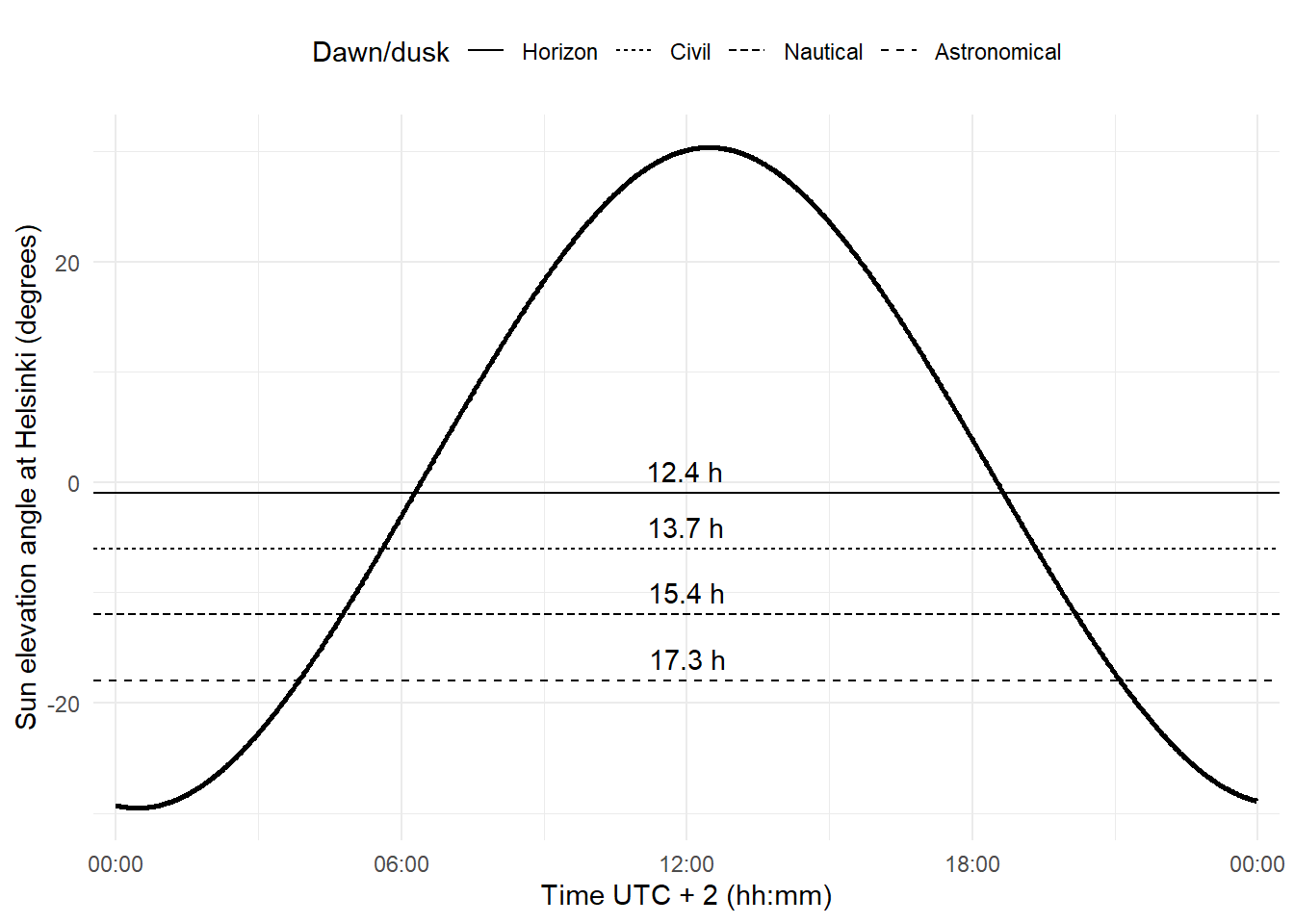 Even though day length or photoperiod duration is normally based on the astronomical horizon, in many cases there are obstacles that occlude the sun from view until later at dawn or earlier at dusk: mountains, vegetation, buildings, etc. Thus, in some cases it may be more relevant for a scientific study with plants to consider sun elevation angles \(h > 0\) as the criterion; even different angles can be used for day start and day end.