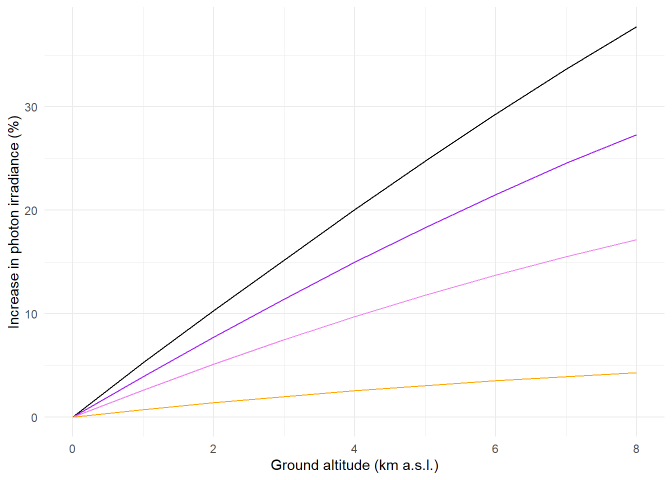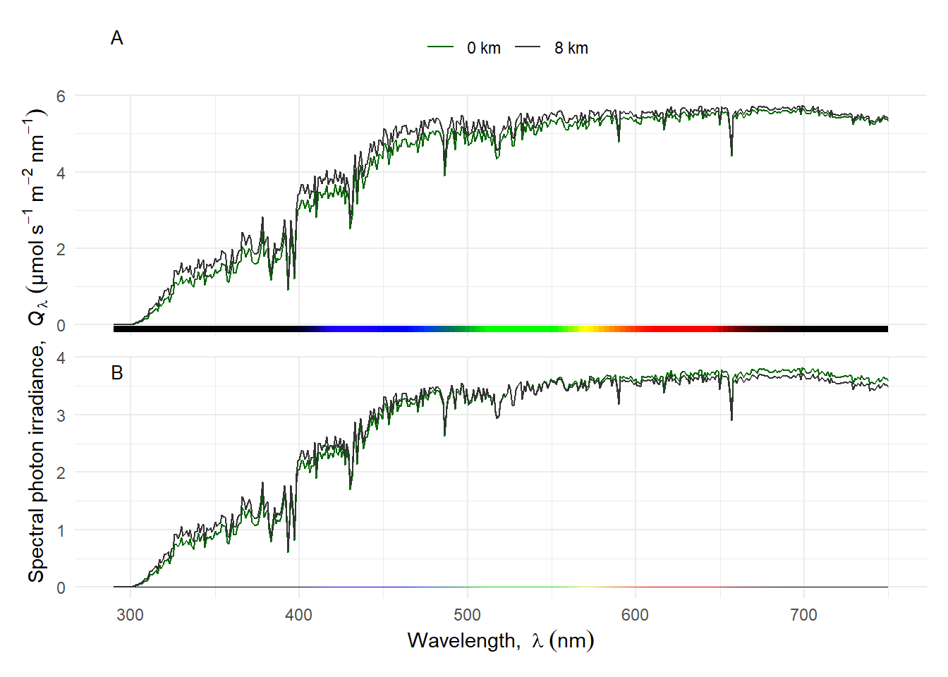 A simulation with the TUV model shows how attenuation by the atmosphere decreases with increasing ground altitude under a clear sky, with all other parameters kept unchanged, including surface albedo. As above, we show the actual spectral irradiance and the spectral irradiances scaled to equal PAR photon irradiance. The effect is not huge and the decrease in attenuation is stronger at shorter wavelengths Figure 4.27.
