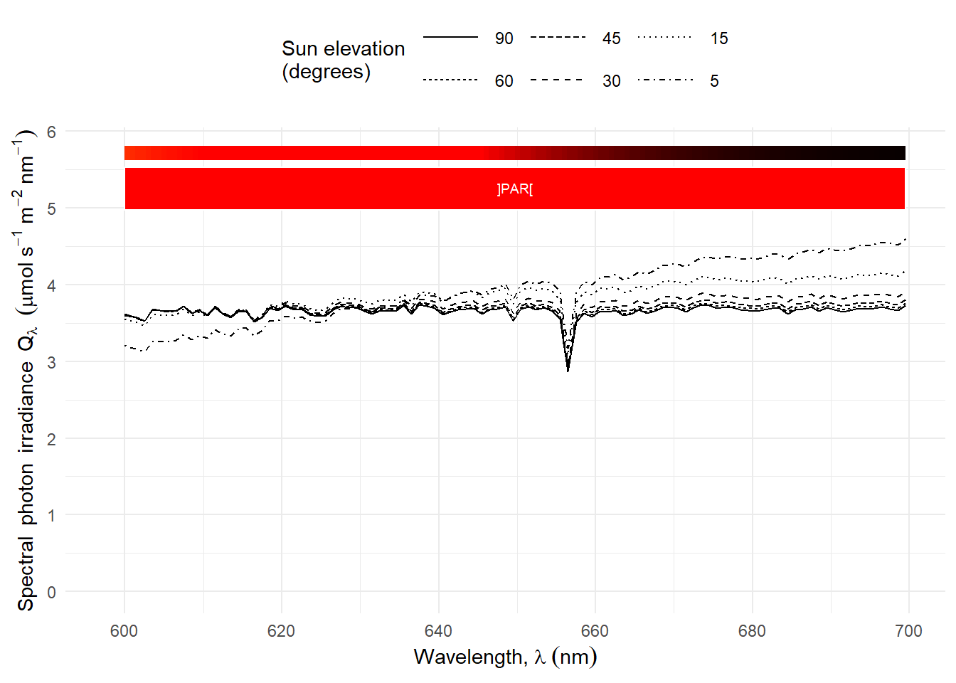 If we rescale the curves to equal PAR irradiance the change in shape is easier to observe Figure 4.14.