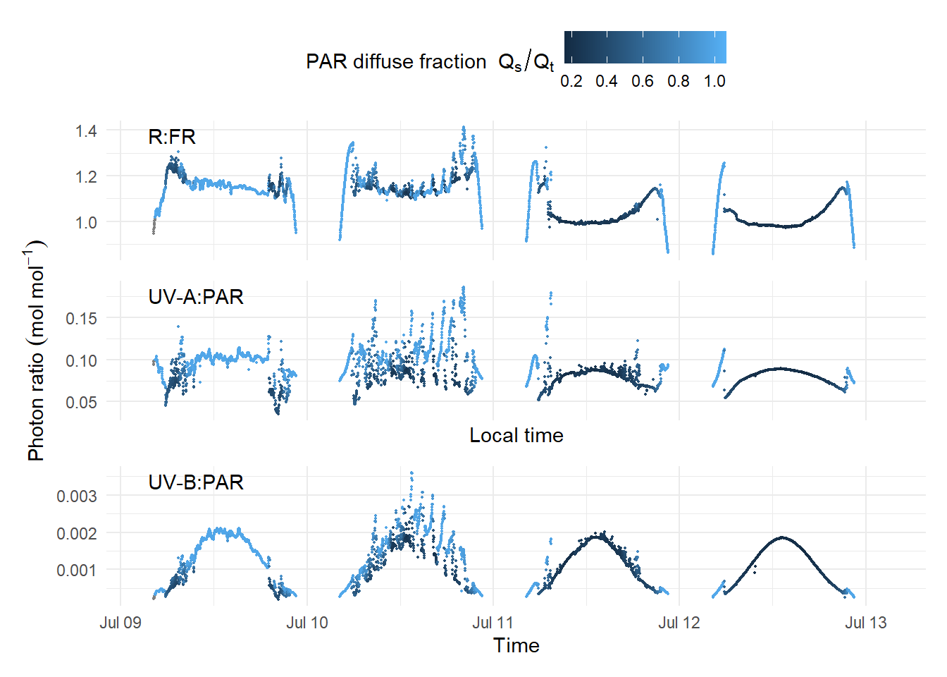 The photon ratios for the same four days Figure 4.23 shows the influence of clouds and of sun elevation, both affecting the PAR diffuse fraction. In particular, broken clouds on 10 July cause momentary nearly doubling of the UV-A:PAR and UV-B:PAR photon ratios. The short-term effect on the R:FR is smaller, but the differences between days larger, possibly because of its dependence on the atmospheric water content (kotilainenxxxx?).