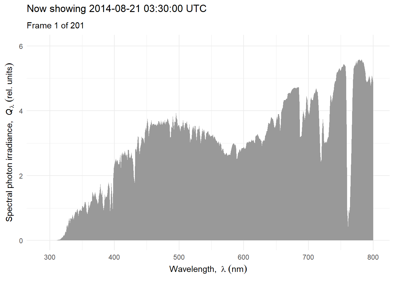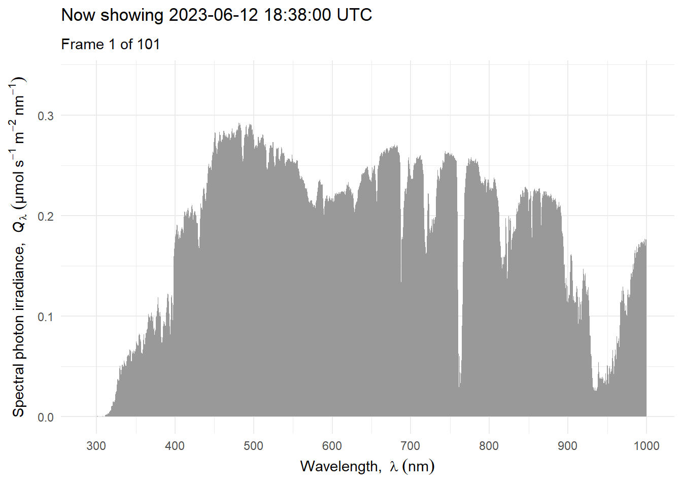 Above we have ignored the effects of clouds and relied heavily on simulations for clear-sky conditions. Next we will consider the effect of clouds and use as examples measurements and simulations that include the effect of clouds. We will consider variation at different time scales. We start with a time series of hourly mean spectra for one day, scaled to equal PAR photon irradiance to illustrate how the shape of the spectrum can change during the course of day Figure 4.21.