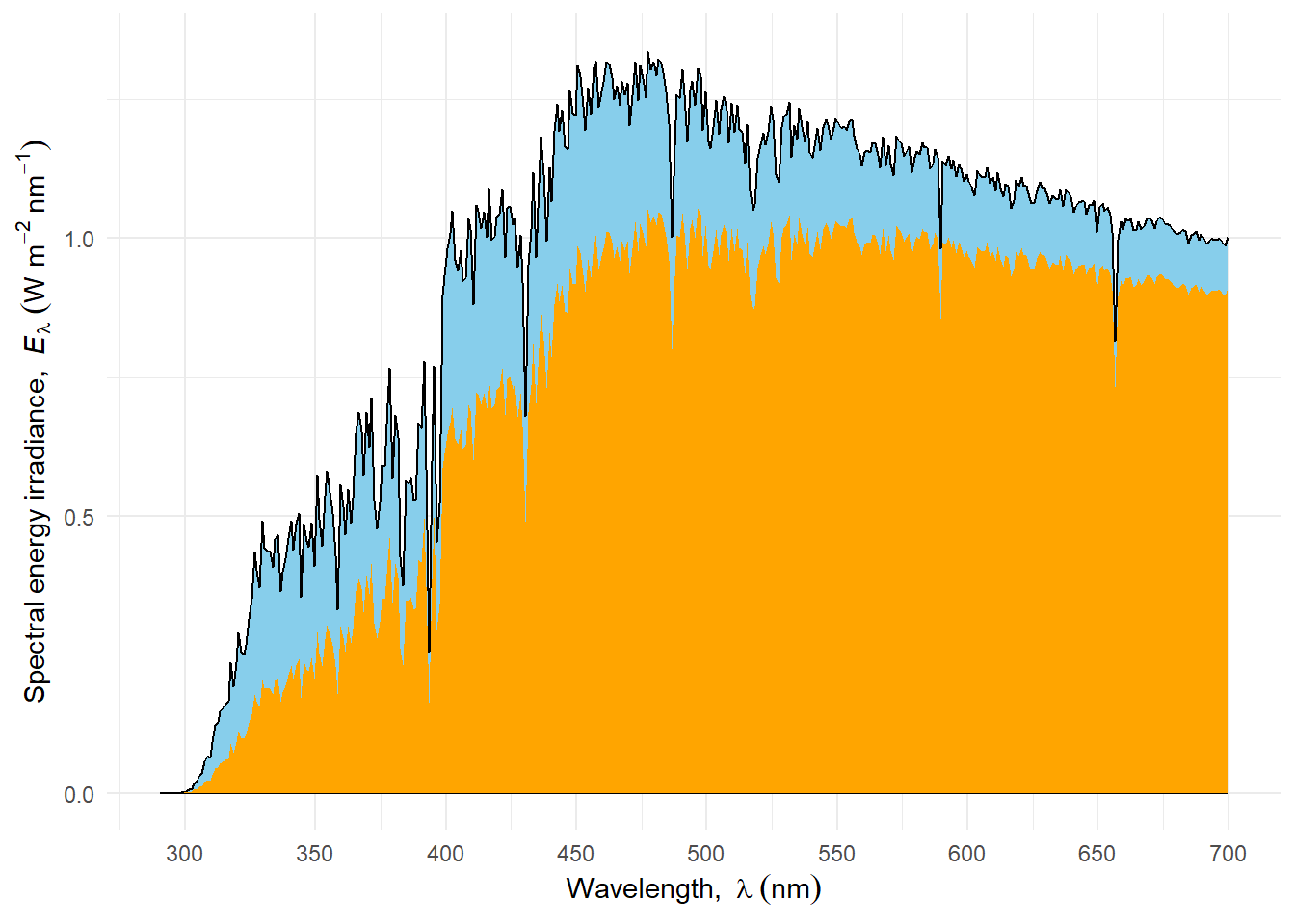 | Waveband | Wavelength \(\lambda\) (nm) | Irradiance \({E_{\mathrm{}}}\) (\(W m^{-2}\)) | Irradiance \({E_{\mathrm{}}}\) (%) |