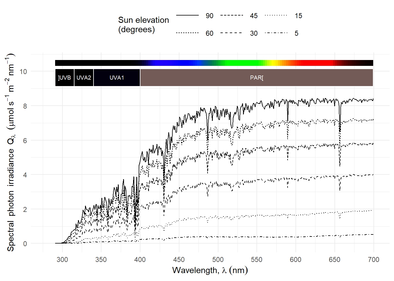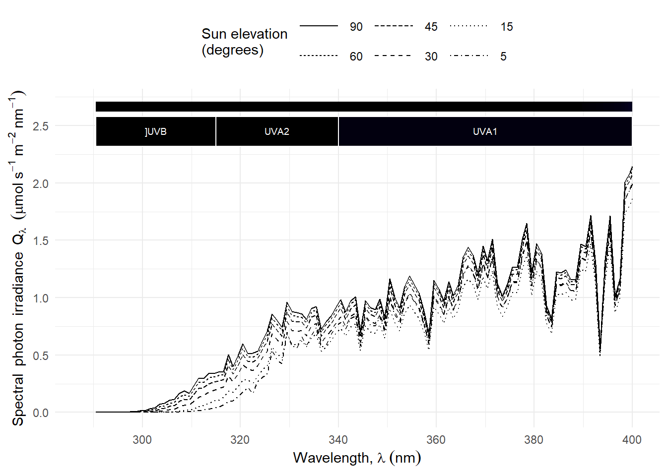 Plotting the normalised photon irradiance for different wavebands Figure 4.16 shows that the daily course of UV-B photon irradiance is different than that for other bands, even the adjacent UV-A2. UV-B irradiance decreases faster with decreasing sun elevation (\(h\)).
