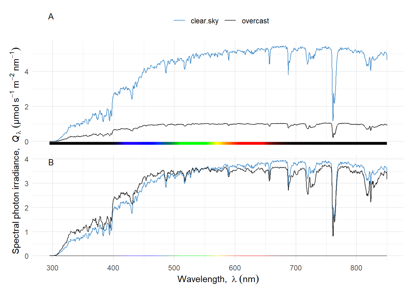 Irradiance is much lower under cloud cover than in full sunlight under a clear sky Figure 4.26. The cloud light spectrum is shifted towards shorter wavelengths, i.e., shade light is bluer (or cooler) than full sunlight, more easily seen after scaling the spectra to equal irradiance Figure 4.26. For this example the coordinated colour temperature (CCT) was 6190 K and 5580 K for the overcast and clear sky, respectively.