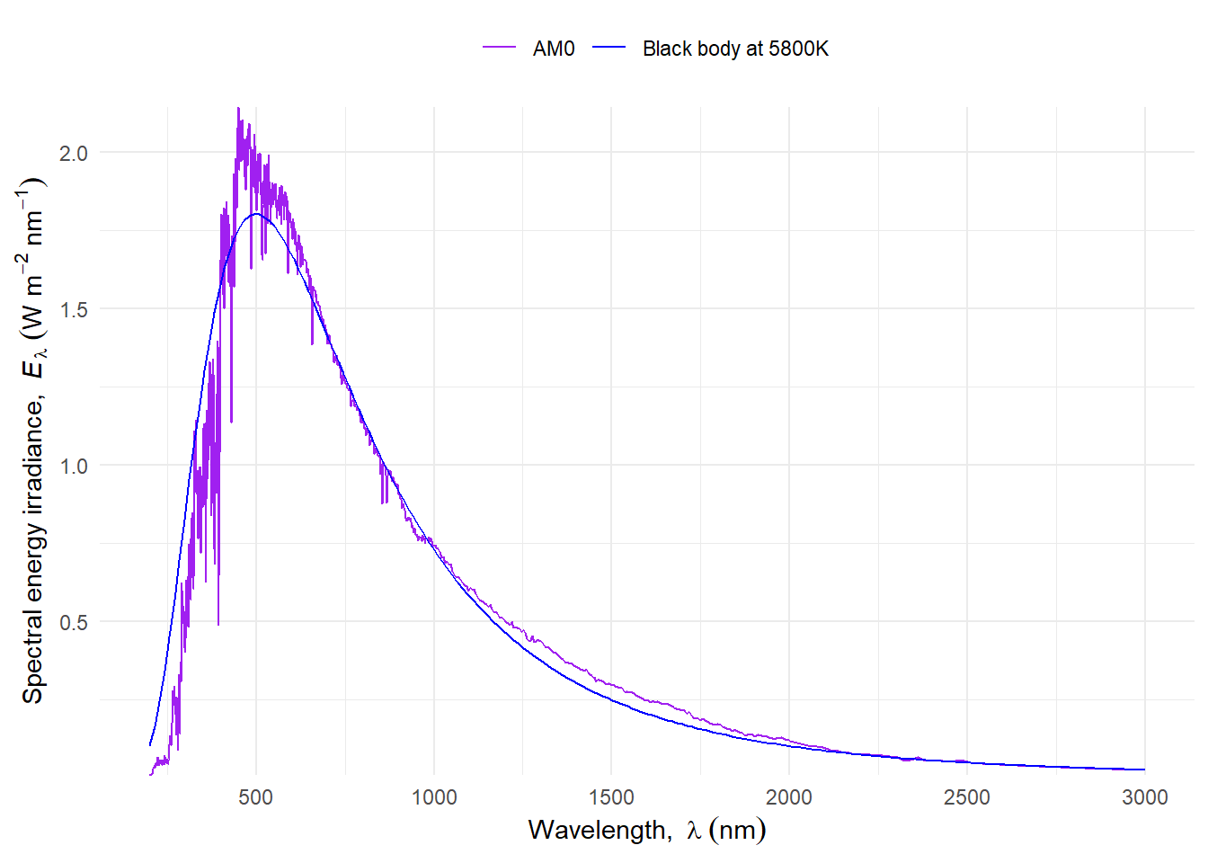 The energy radiance (\(L\)) of radiation emitted by the sun is similar in shape, but not identical, to the emission spectrum of a black body. The solar spectrum has a fine structure of peaks and valleys arising from the atoms and molecules in the sun while black body emission is described by a smooth curve. A “match” based on the wavelength at which spectral energy radiance is at its maximum can be used as criterion to estimate the temperature of the sun’s surface. Obviously, we use the extraterrestrial spectrum for this match. We see in the AM0 curve in Figure 4.11 that the wavelength at the maximum is near 500 nm. In reality the temperature of the sun surface is not uniform, and different sources mention as its average temperatures between 5800 K and 5500 K. Comparing the AM0 curve in Figure 4.11 to the 5800 K curve in Figure 4.7 the similary of their shapes is clear.