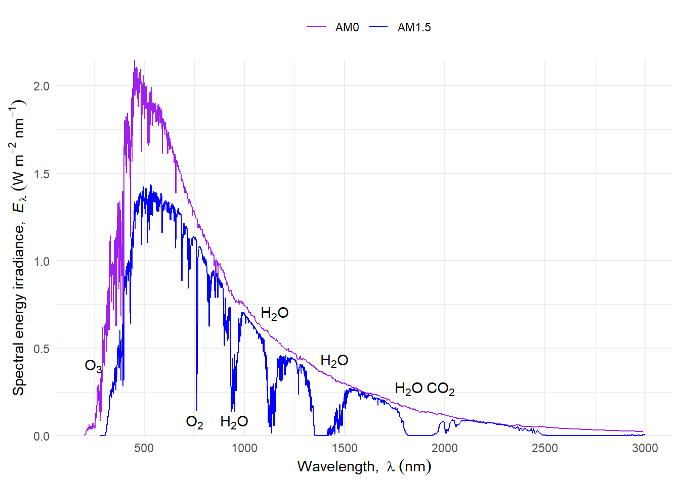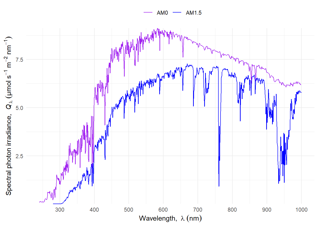 Before reaching the Earth’s surface radiation from the sun travels through the atmosphere. The sun elevation angle affects the length of the path that the light arriving from the sun travels through the atmosphere. In atmospheric physics it is common to describe spectra as corresponding to AM0 for above the atmosphere, AM1 when the sun is at the zenith, i.e., one atmosphere thickness and AM1.5 when the length of the air mass traversed is 1.5 times that when the sun is at the zenith.