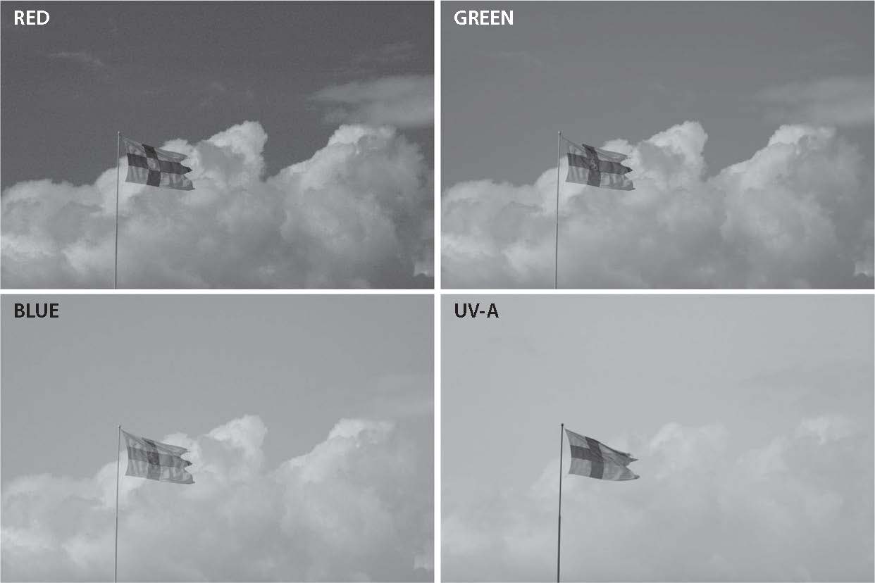 At the Earth’s surface, the incident radiation or global radiation has two distinct components, direct radiation and diffuse radiation. Direct radiation is radiation travelling directly from the sun, while diffuse radiation is that scattered by the atmosphere. Diffuse radiation is what gives the blue colour to the sky and white colour to clouds. The relative contribution of direct and diffuse radiation to global radiation varies with wavelength and weather conditions. The contribution of diffuse radiation is more in the UV region, and in the presence of clouds (Figures [fig:sky:photos] and [fig:diffuse:UV]).